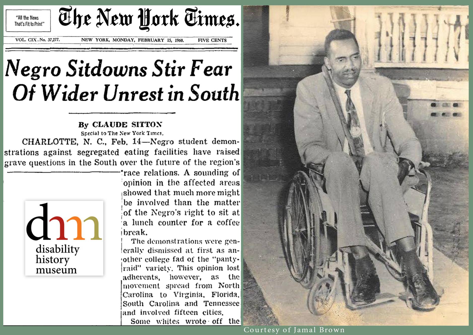 Image: On the left, an image of a New York Times page with the masthead and the beginning of an article “Negro Sitdowns Stir Fear Of Wider Unrest in South.” The Disability History Museum logo is superimposed. On the right, a photo of Reverend Ivory in a suit and tie sitting in a wheelchair on the sidewalk in front of a porch.